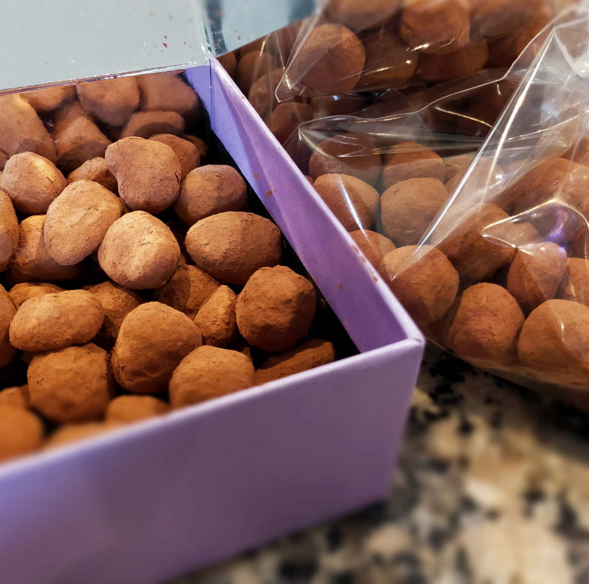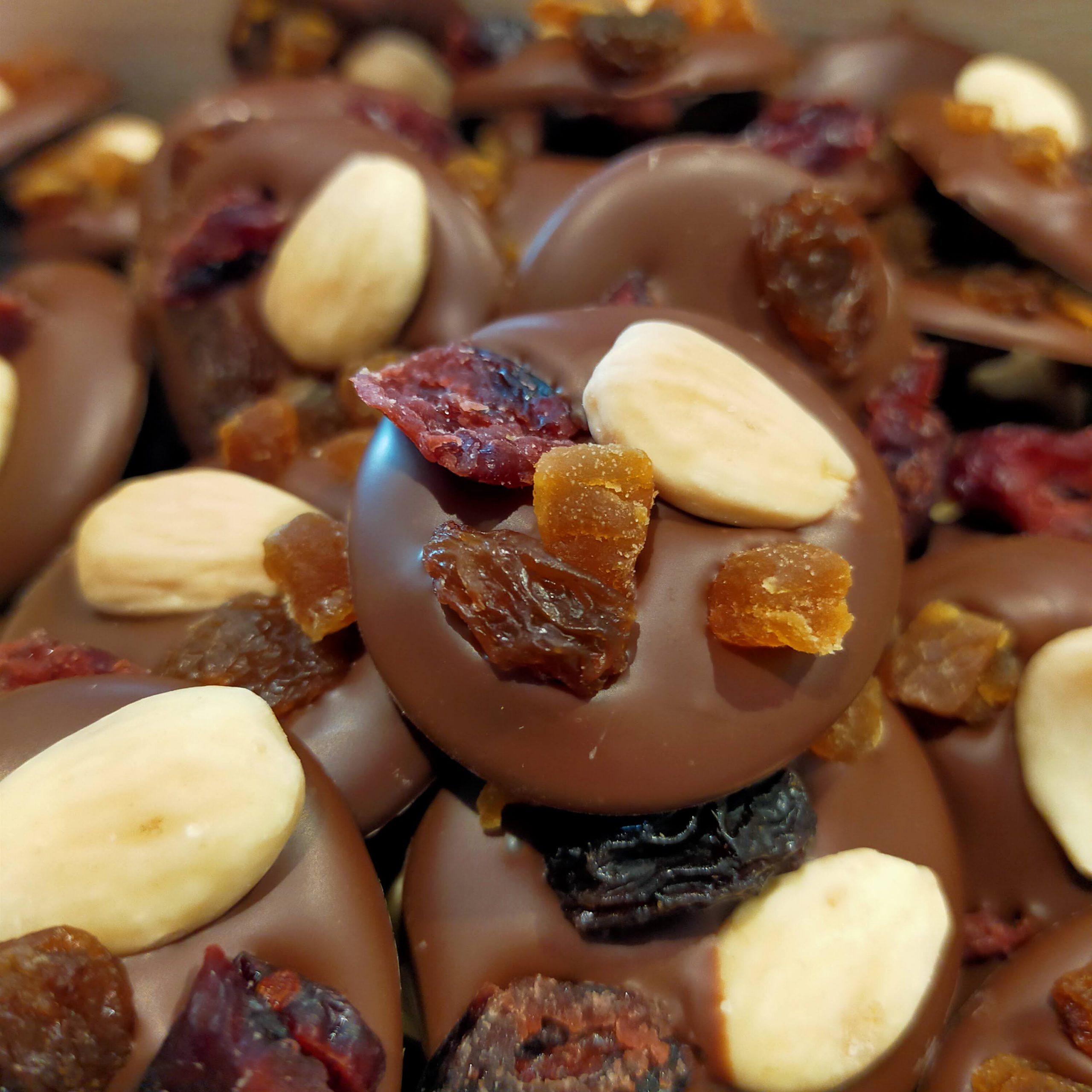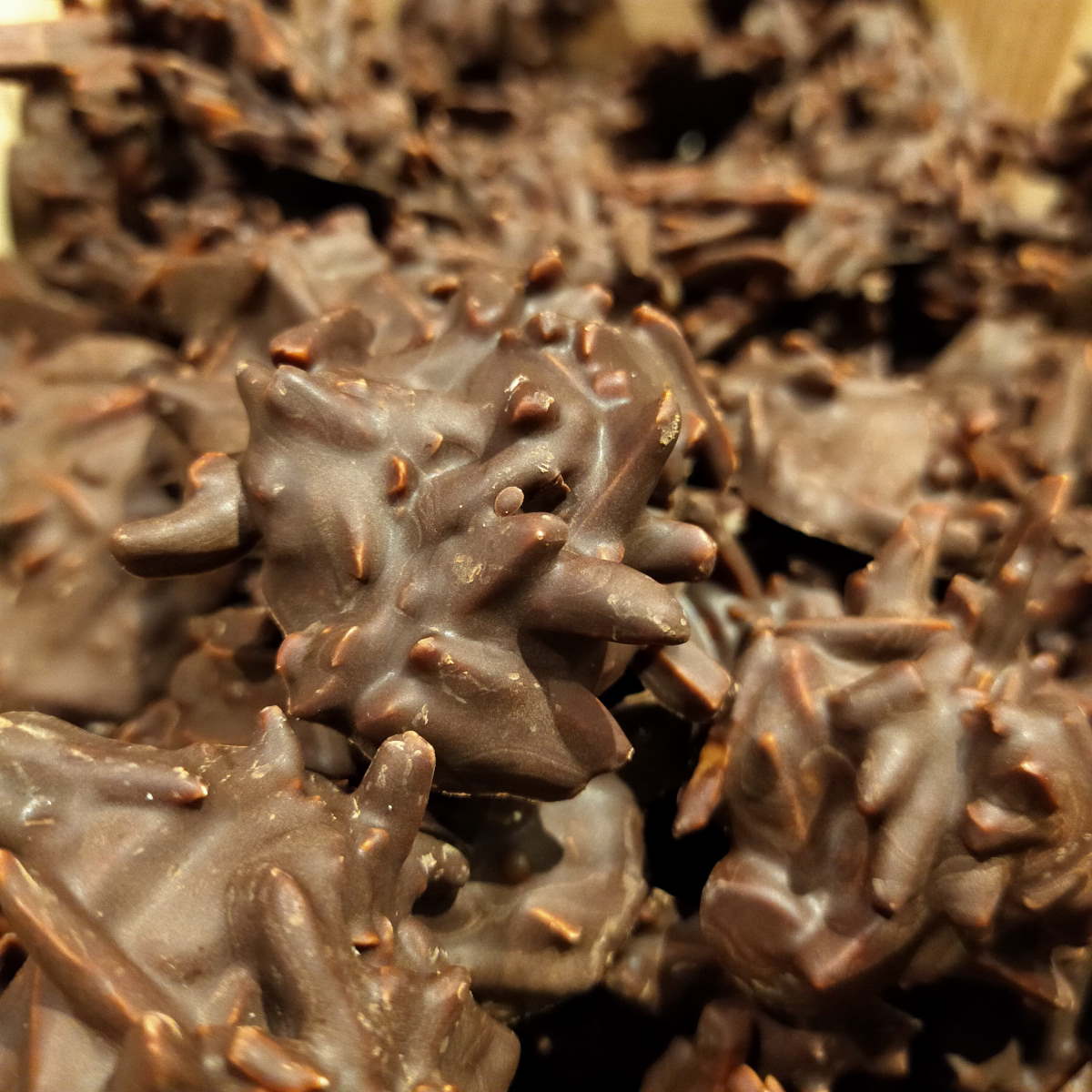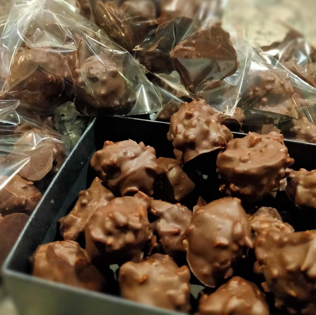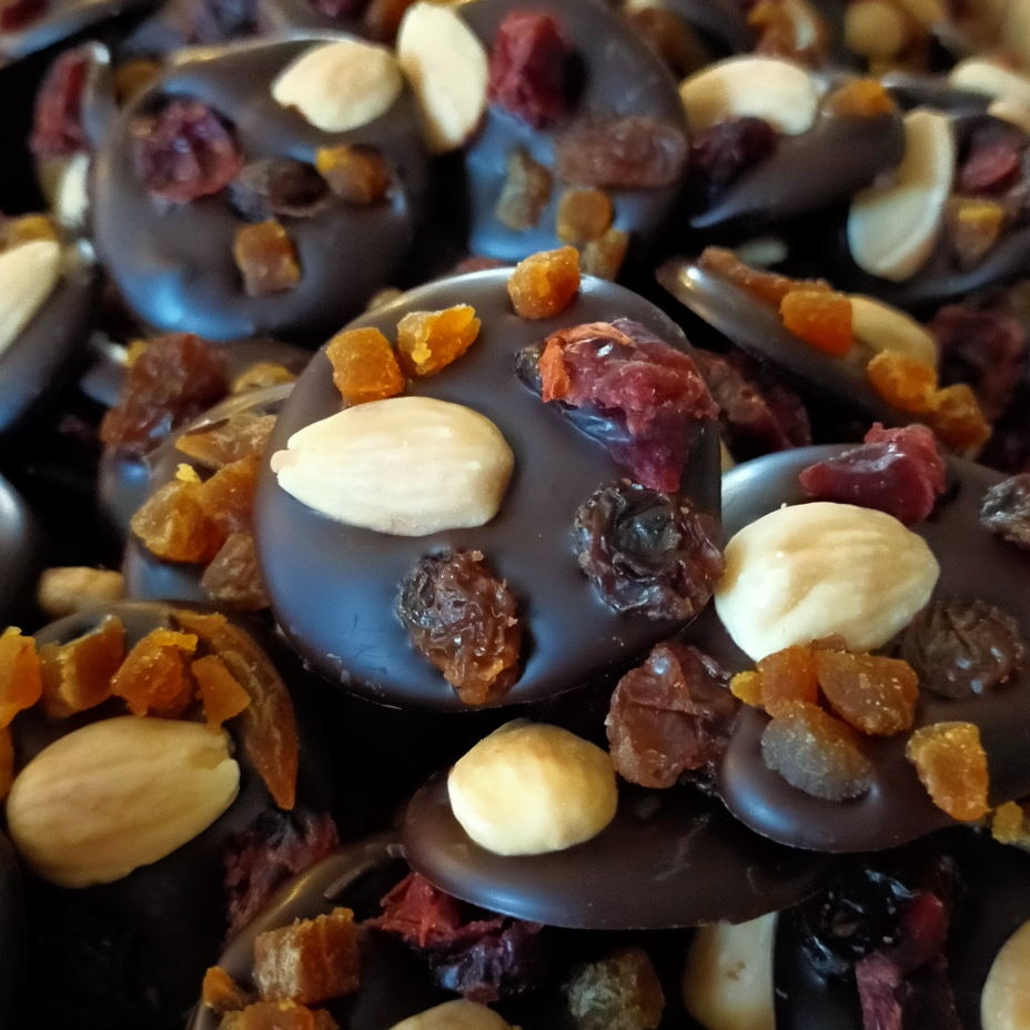 Je ne produis pas (encore?) moi même le chocolat, mais fais tout le reste à la main. Mendiants, rochers, truffes, … Autant de bonbons au chocolat à déguster en toute circonstance.